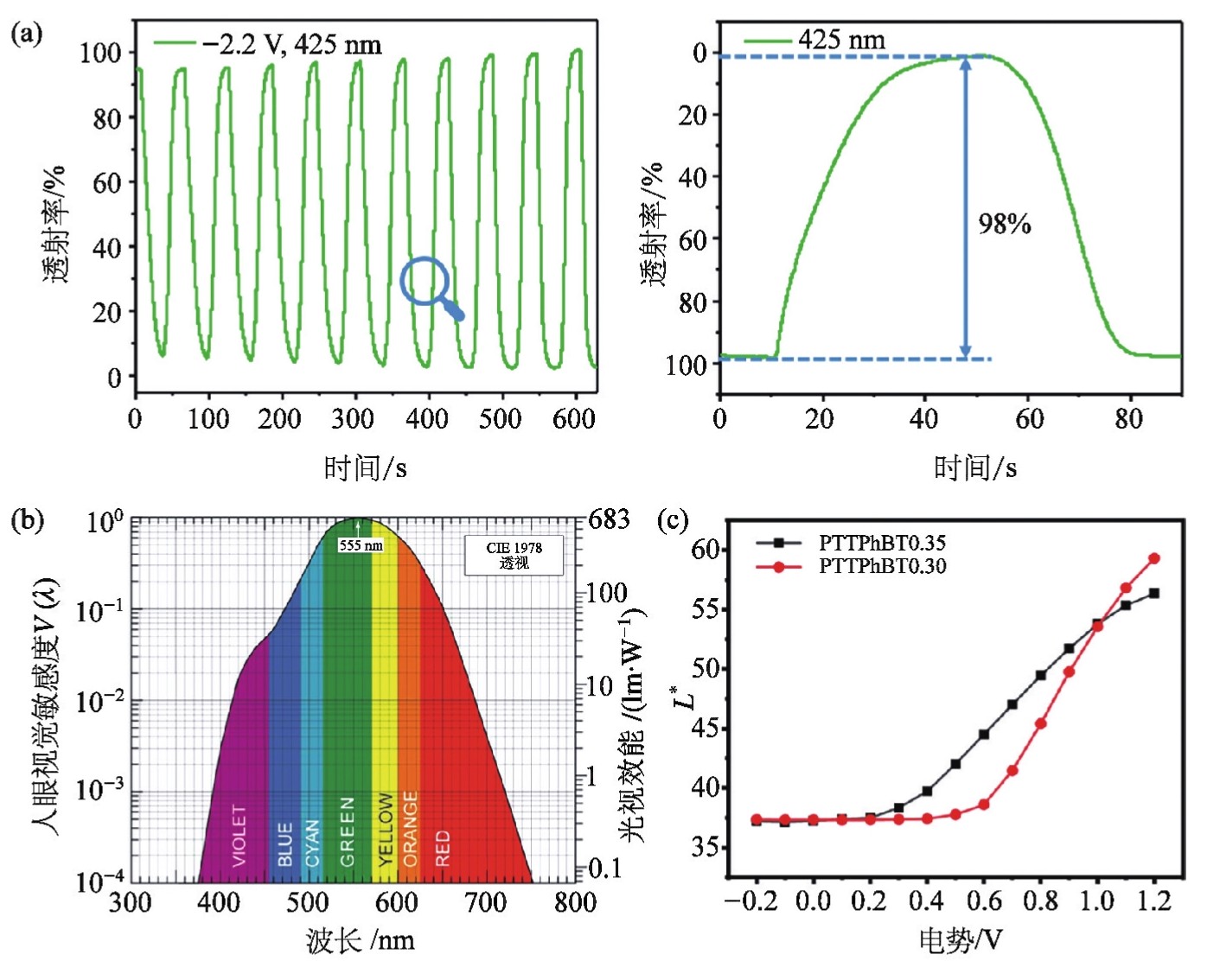 图1.5 小分子EC材料的电致变色对比度 [24] (a),人眼的灵敏度函数V(λ)和发光效率与波长的关系(来源:Wikimedia Commons)(b),该材料从中性到氧化态的亮度值的变化 [21] (c)