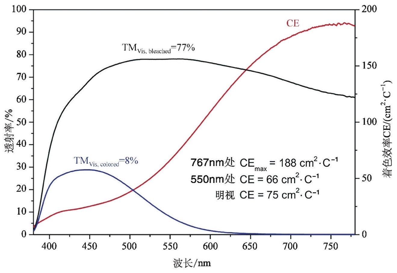 着色效率(CE)在评估电致变色过程中的电荷利用效率时起着基本作用。它将EC材料在给定波长下的吸光度变化(ΔA)与诱导其完全转换(Q d )所需的注入/排出的电化学电荷的密度相关,CE值越高,表明在一个较小的电荷注入下可以实现的透射率变化越大,即可以更有效地利用注入的电荷。CE值可以使用以下公式计算