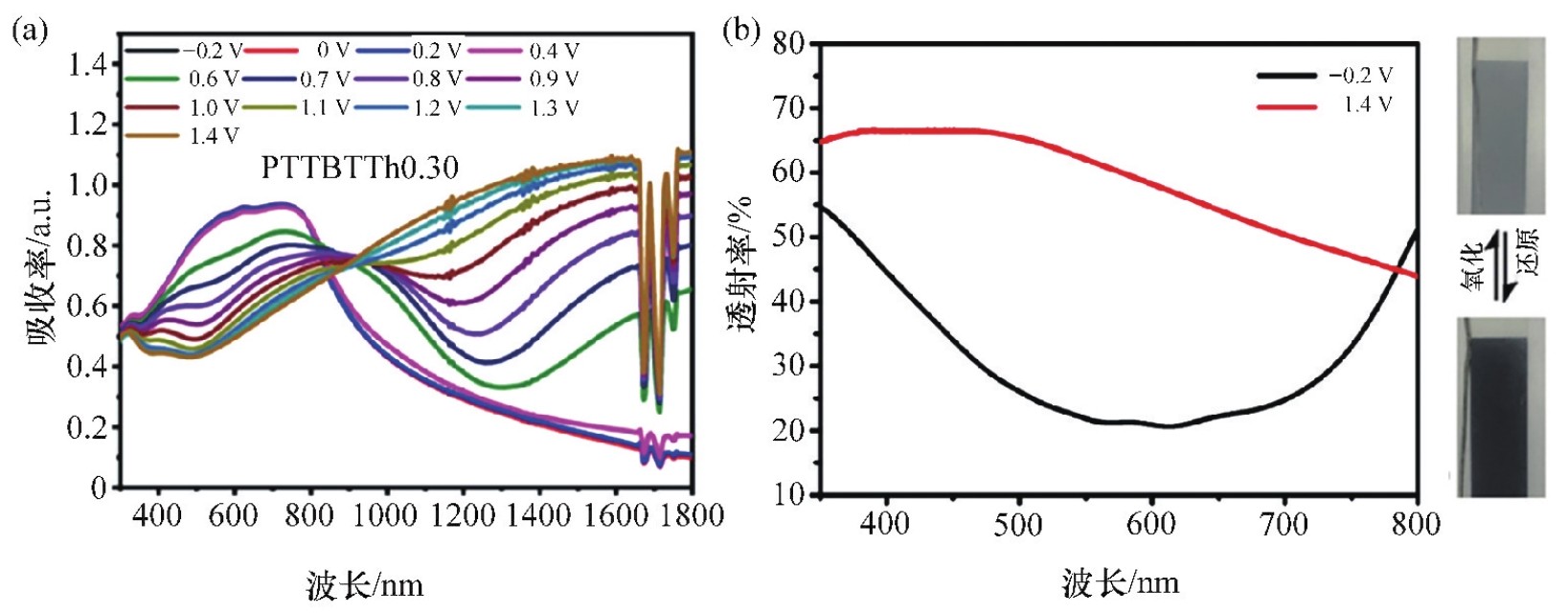 为了评估电致变色材料的性能,通常需要联用分光光度计和电化学工作站,进行原位UV-Vis-NIR光谱电化学(SEC)测量,该SEC光谱动态记录了在不同施加电压下电致变色材料的吸收率或透射率的变化,从而反映整个氧化还原过程中材料的颜色变化。例如,图1.4显示了一种黑色到透明的电致变色材料的SEC,其中图1.4(a)采用吸收率模式,图1.4(b)采用透射率模式。在实际的研究中,两种模式都得到广泛的应用。