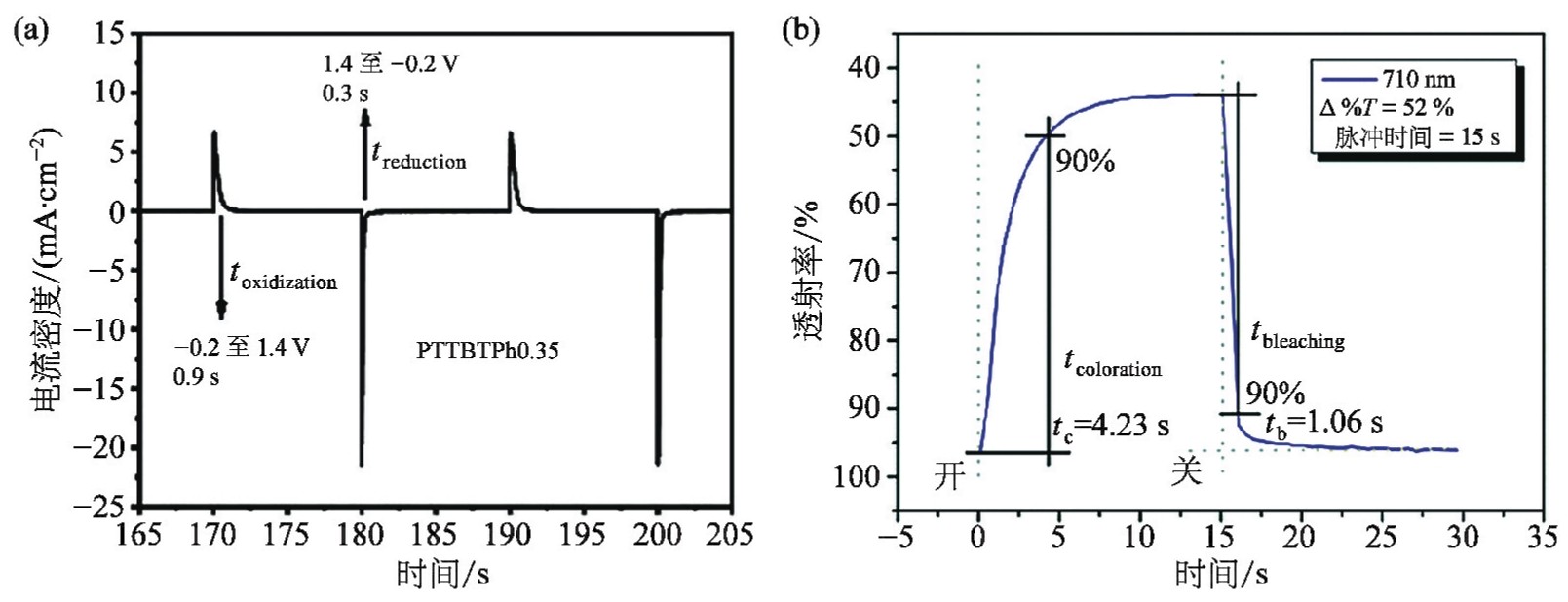 电致变色材料的响应时间(t)是反映材料切换速度快慢的参数,也是采用方波阶跃电位与光学光谱相结合的测试方法。响应时间取决于很多方面,例如电解质传导离子的能力,离子在电致变色活性层上的嵌入和脱出的难易程度,电解质和透明电极的电阻,等等。通常液体电解质的电阻比固体电解质低,因此半器件和液体电解质的EC器件会比全固态EC器件的响应时间更快。同时,由于透明电极的电阻随着面积的增大而增大,所以与小型实验室样品相比,大面积EC器件(例如大型的智能窗口)的响应时间会有所增加。但是,并非在所有应用场景中都需要快速的响应时间,例如在智能窗户的应用中,明显的颜色变化过程会增加用户体验的趣味性。相反,对于一些显示的应用会要求亚秒级的响应时间。