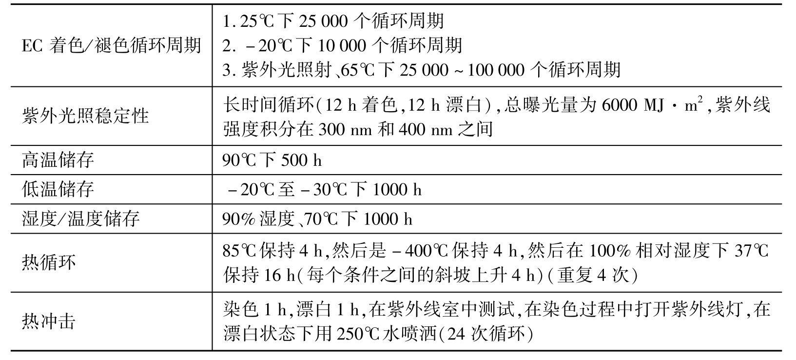 但是,如果考虑到电致变色设备在建筑物窗户中的实际应用,对于耐用性和可靠性则有更严格的条件。例如,必须要有超过10 6 个循环周期才能达到20年的使用寿命,极端气候条件(例如低于-20℃和高于40℃的温度)对EC材料和电解质以及其他降解因素均构成巨大挑战,例如高的太阳辐射水平、快速的温度变化、不均匀的温度分布和附加应力、雨水、湿度、机械冲击和干燥。因此,在1998年,卡尔·兰伯特(Carl M.Lampert)提出了针对电致变色的商业化应用的标准测试指南 [27] ,如表1.1所示。最近,国际标准化组织(ISO)还发布了一个国际标准《建筑玻璃 电致变色嵌装玻璃 加速老化试验和要求(ISO 18543:2021)》。