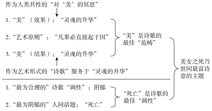 坡的小说诗学命题当中最为突出的莫过于那极具传奇色彩的“美女之死”(death of a beautiful woman) 。它一方面为批评界所津津乐道,而另一方面却又总是被普通读者乃至专业学者想当然,以为那不过是坡为了自圆其说而做出的权宜之计,抑或是为了属人耳目而进行的故弄玄虚。在1846年4月《格雷厄姆杂志》上发表的《创作的哲学》一文中,坡通过一系列逻辑推衍得出一个著名的结论:“美女之死毫无疑问是世界上最富诗意的主题。”