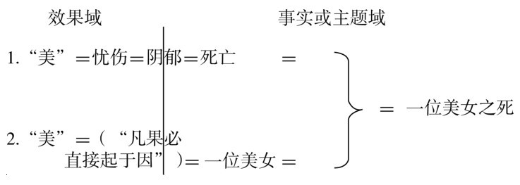 可以看出,为了让坡陷入循环论证的“圈套”,沃尔卡特刻意将“美”与“阴郁”和“死亡”直接画上了等号,但坡本人的意图乃是说明:“阴郁”是诗歌的最佳“调性”,而“死亡”又是“最为阴郁的人间话题”,因此“死亡”能够将诗歌的最佳“调性”发挥到“极致”(supremeness) ;换言之,坡围绕“忧伤”“阴郁”及“死亡”所做出的逻辑推衍其实是为了强化这样一种概念,即“死亡”是诗歌的最佳“调性”。另一方面,沃尔卡特未曾注意到坡在推衍进程中对“ effect”一词所持的游离立场:首先是作为“美”的“效果” ,也即美之“印象”(impression) ;其次通过“凡果必直接起于因”那一公认的“艺术法则”将“效果”转切为逻辑因果论意义上的“结果”。如此一来,坡的“效果论”实际上既肯定了“效果”作为“美学体验”的重要价值,与此同时也更为强调“效/结果”在因果律意义上存在的合法性。在笔者看来,坡的逻辑推衍图示理应如此呈现: