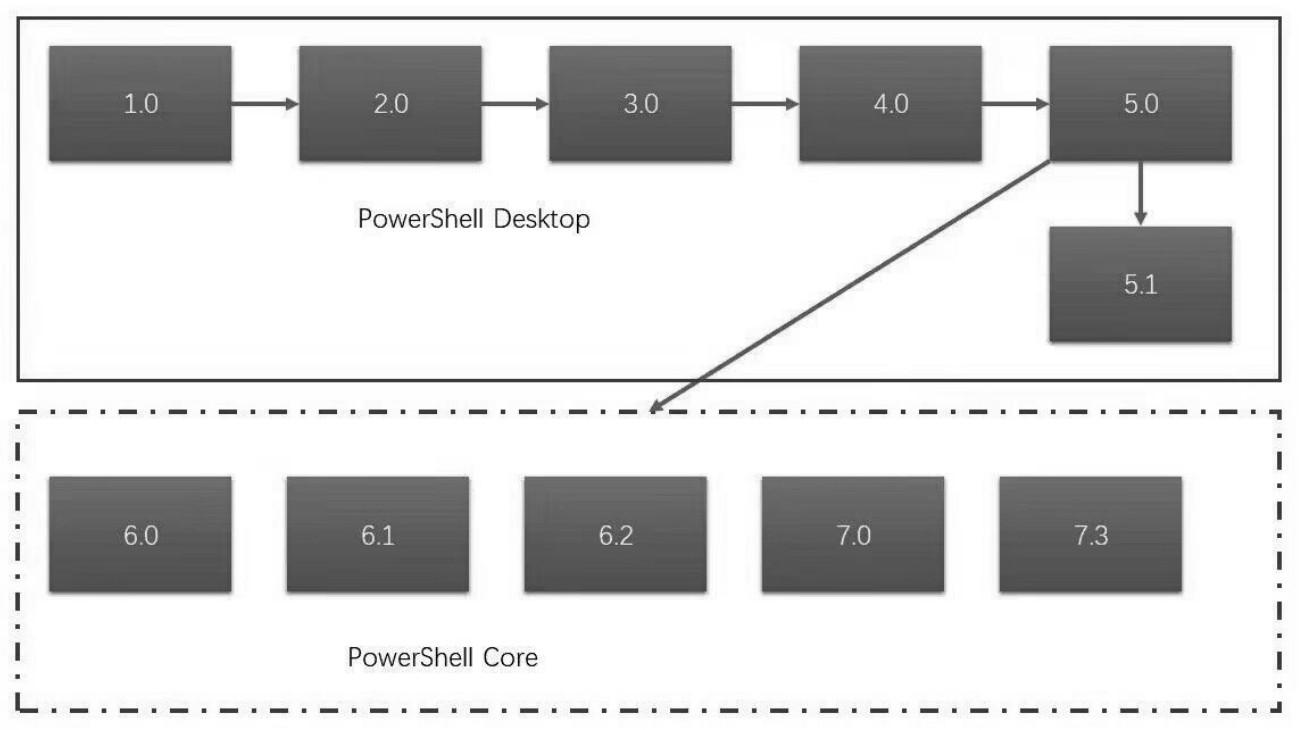 从PowerShell 的整体发展路线来看,PowerShell 在5.0版本之后分支为两个版本。图2.8所示为PowerShell目前的分支版本发展过程。
