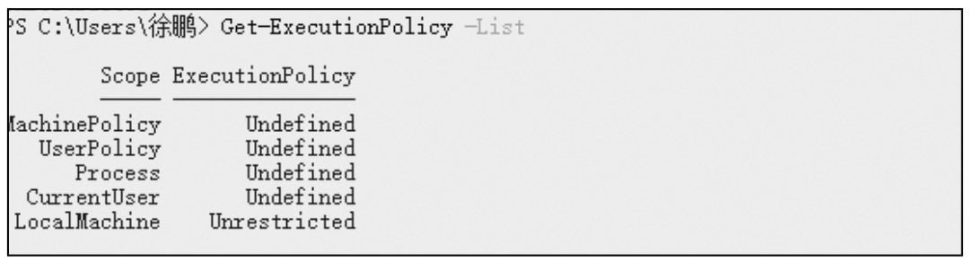 在系统中,不同的用户和不同的计算机有自己的执行策略。而这些执行策略也存在执行的范围,通过执行Get-ExecutionPolicy-List 可以查看到PowerShell 执行的范围,图2.21所示为当前系统中的策略范围和执行策略。