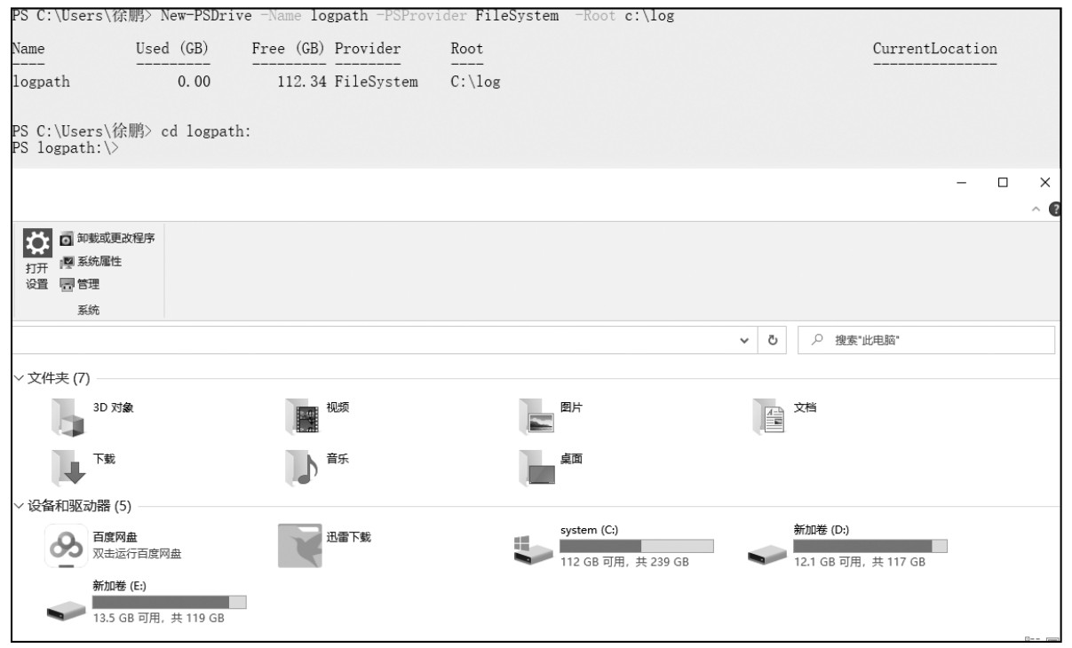 注:建立的PSDriver只能在PowerShell中使用,如果脱离了PowerShell执行环境,其他的Shell都无法使用PowerShell的PSDriver,在PowerShell中创建的磁盘快捷路径不会出现在PowerShell之外的环境。