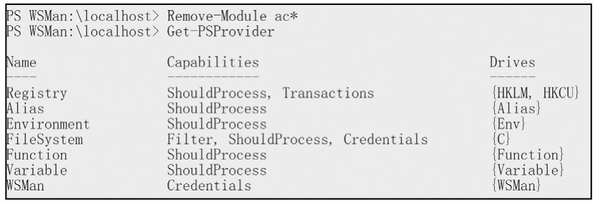 在实际的应用场景中,程序和模块提供的Provider 远远超过了系统默认的Provider数量。部分模块和管理单元构建了可用的Provider,让系统管理员基于PowerShell的Provider 更加快速地完成相应命令的执行。PowerShell中Provider 随着模块加载而载入,这里通过执行如图3.21所示的Get-PsProvider命令能够获取当前系统中默认加载的Provider。