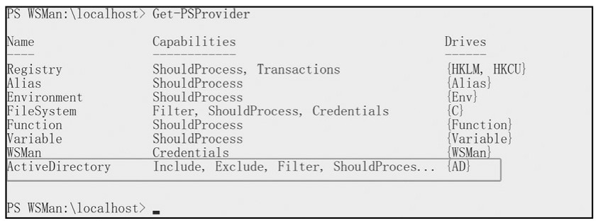 默认情况下第三方的Provider不会加载到当前的PowerShell中,我们需要通过Import-module命令加载相关的模块之后,相关的Provider 才会被加载进来。这里以活动目录模块为例,图3.22所示是在我们执行完成活动目录的获取用户命令之后获取的Provider。