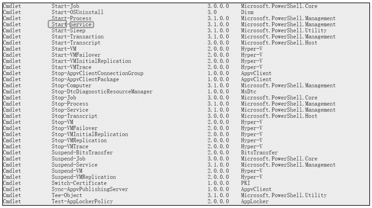相信大家能够发现,命令都是非常固定的格式。动词可以定义为行为,而行为一定要有目标,目标这里就是定义的名词。“动词+名词”结构构成了PowerShell的Cmdlet的组成方式,而且这种定义与人的自然语言很相似。这种结构让使用者通过前面的动词就能猜测出行为,大家能猜出下面使用非常频繁的单词代表的意思吗?
