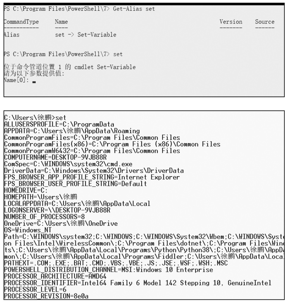 图4.2 CMD环境和PowerShell环境中的Set命令对比