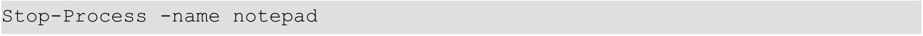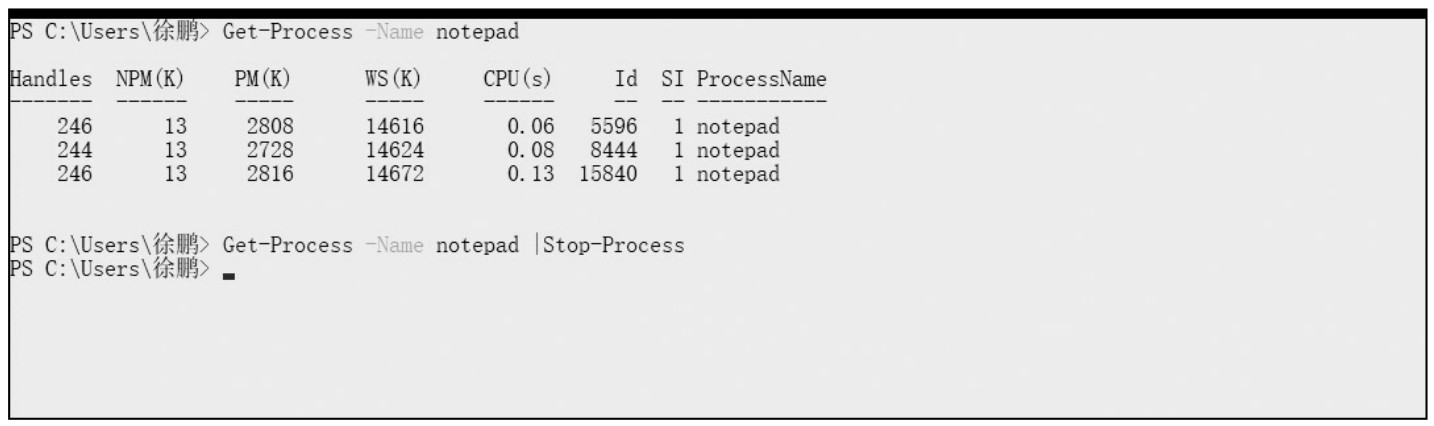 Get-Process 支持管道输入,如果希望停止一系列名称的进程对象,则可以通过Get-Process 传入管道符右边的数据完成批量的进程停止。图4.61所示为相关的操作方法。