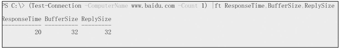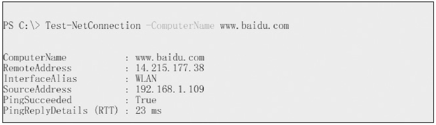 PowerShell中有Test-Connection,同样可以获取当前的地址到目标地址的结果。相比Ping的方式,Test-Connection 获取的数据相对更加灵活,图4.63所示为我们直接获取当前Ping过程中的值。