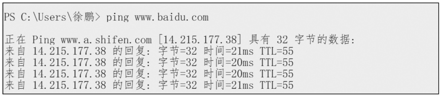 相信大家都使用过Ping 来获取到目标的返回时间,例如,我们通常使用Ping来获取计算机到www.baidu.com 的时间,使用如图4.62所示的命令来获取到百度具体时间。