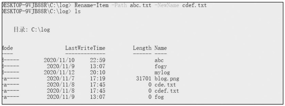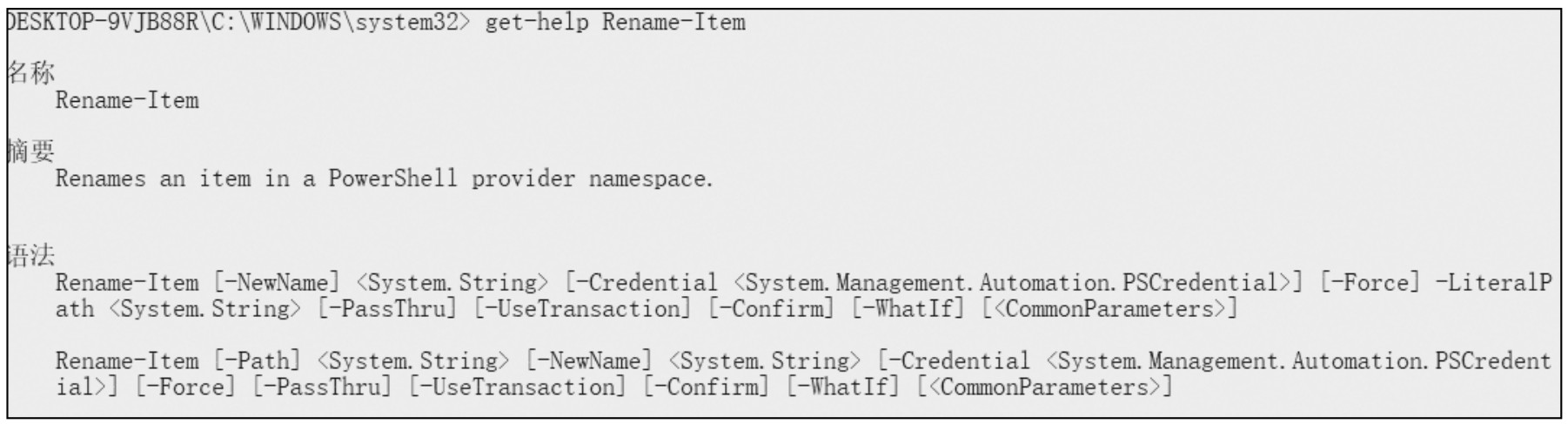 Rename-Item是进行文件和对象改名操作的命令,通常进行对象更名操作的是文件,利用Rename-Item 就可以实现对象的实际更名。图4.42所示为命令的帮助内容。