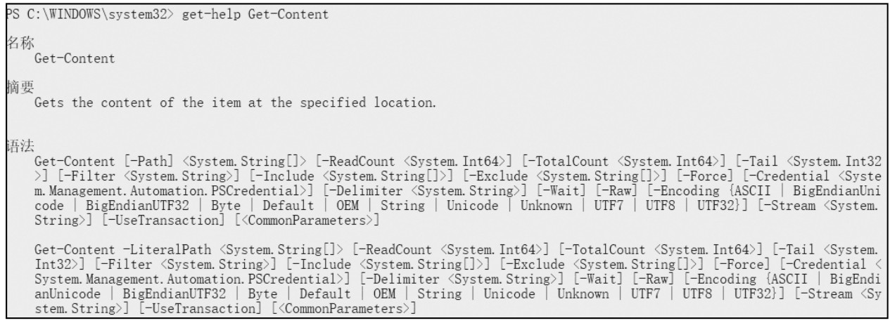 当我们希望获取当前文件内容的时候,可以有多种不同方法进行内容数据的获取。Get-Content可以说是获取文件内容的第一命令,利用Get-Content 可以针对任意类型进行数据获取,如果是文本内容,直接读取为可以解析的字符,如果是图片或其他类型文件,以节码方式读取。图4.48所示为文件内容命令帮助。