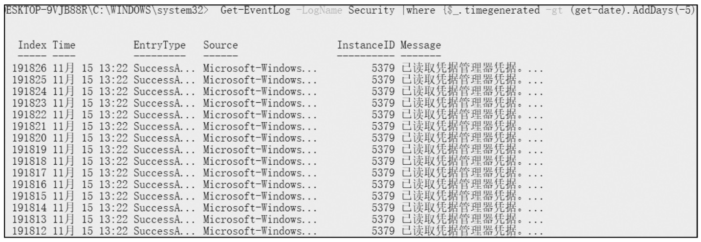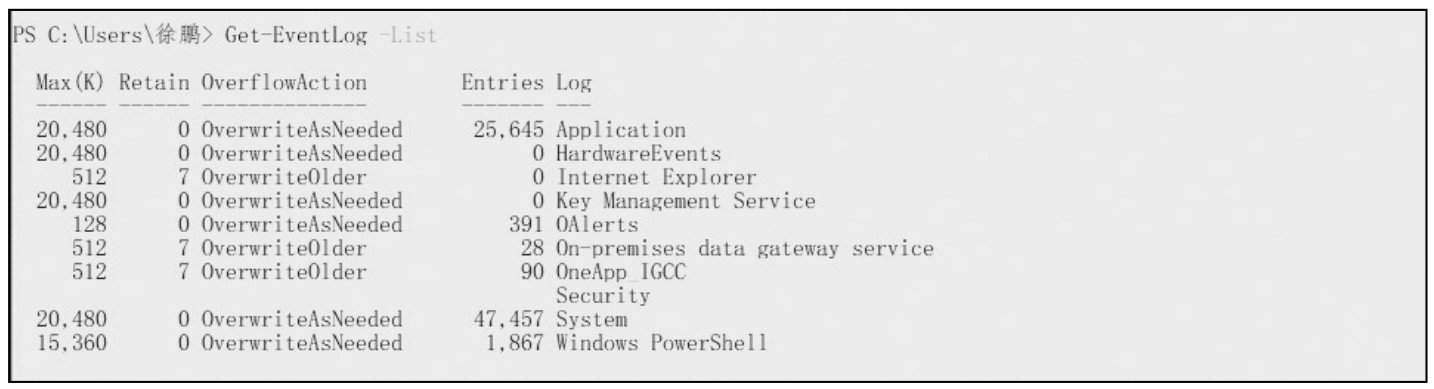 日志系统是系统中非常重要的功能,当需要进行问题诊断、事件查询等操作的时候,日志查询是一个非常重要的功能标准。日常针对日志操作也是管理员最为频繁的功能操作之一。对日志的查询操作是通过PowerShell Get-Eventlog Cmdlet 来进行的,图4.55所示为当前的Get-Eventlog命令的操作。