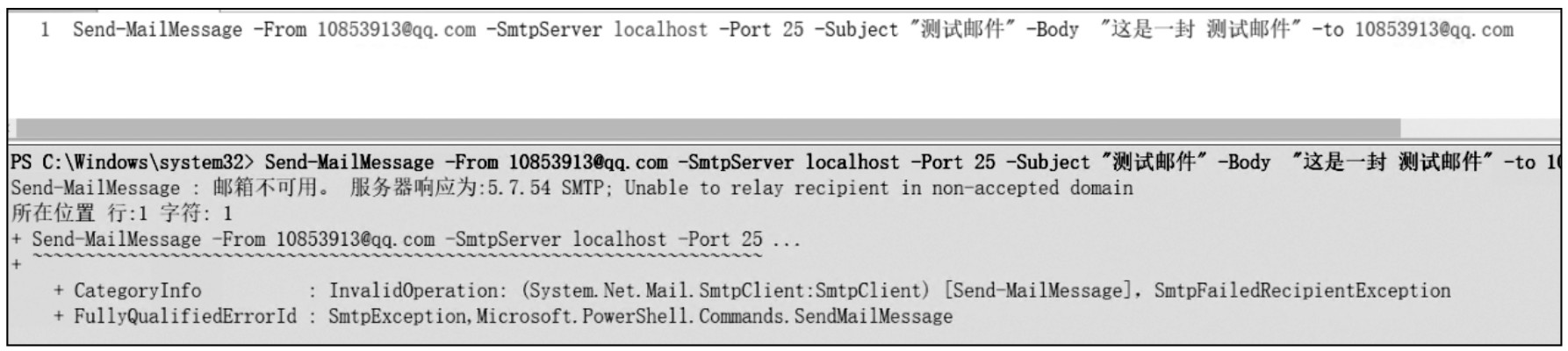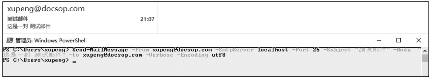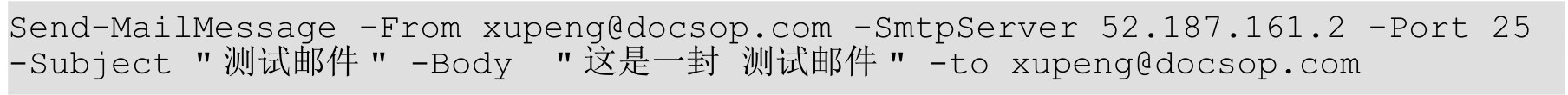 现在解放管理员的PowerShell命令来了,也就是Send-MailMessage。目前所有的Windows平台都集成了Send-MailMessage 命令,可以执行如图4.69所示的PowerShell命令完成邮件系统测试。有了它完全可以忘记Telnet命令测试邮件状态的痛苦经历。