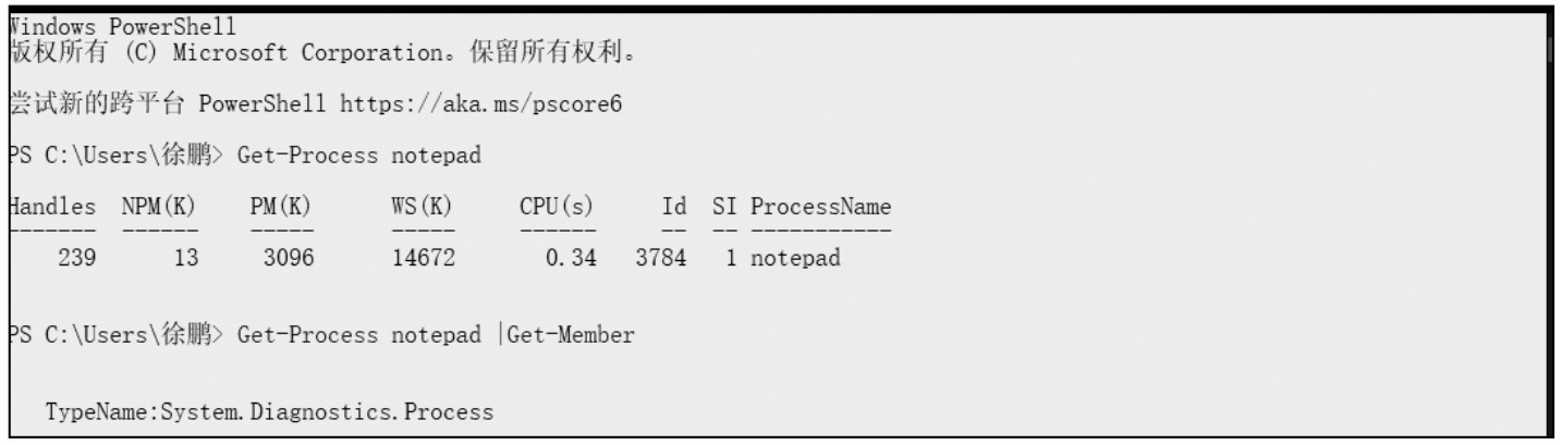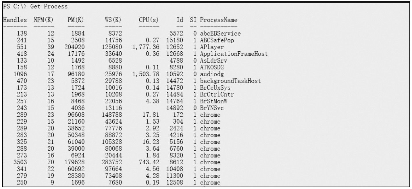 如果希望获取到特定名称的进程,可以在Get-Process后面跟上特定的进程名称来获取特定进程对象信息。图4.59所示为获取特定进程对象方法。