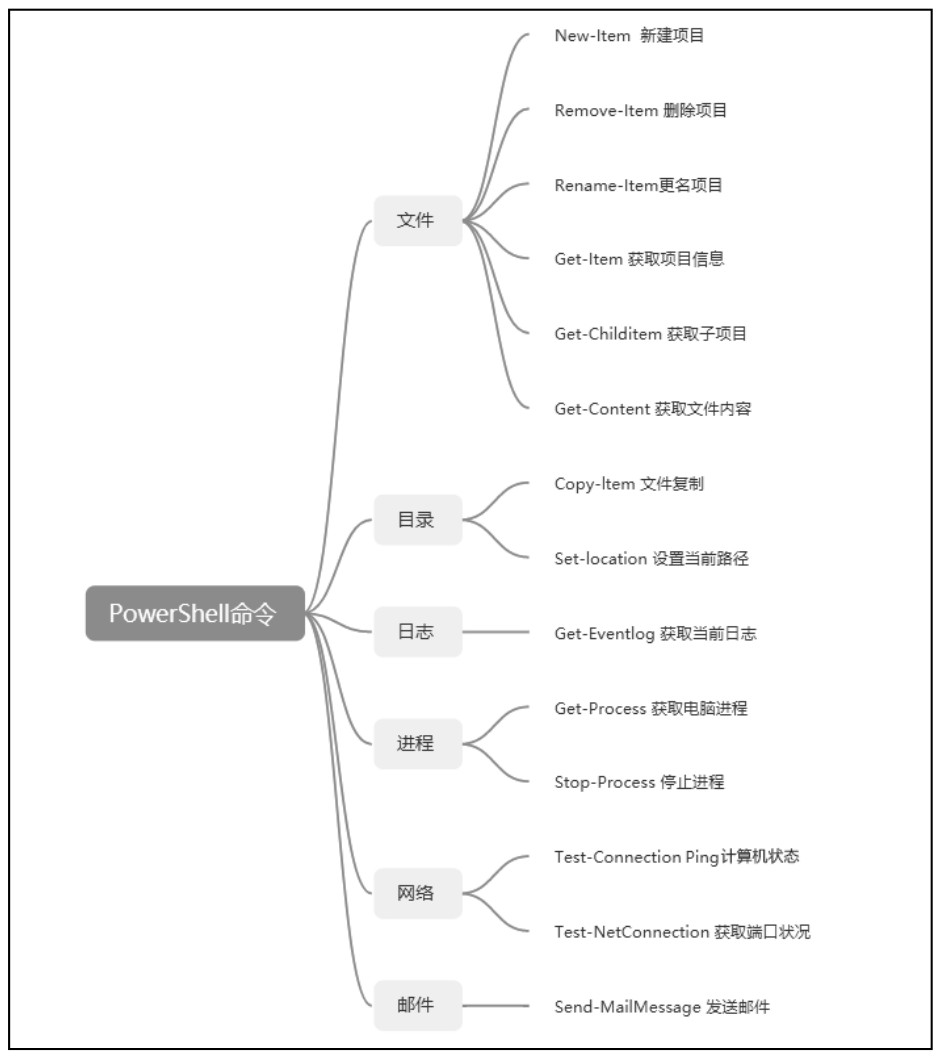 在PowerShell中有哪些Cmdlet命令会频繁使用?来看看如图4.34所示的PowerShell Cmdlet脑图,这是管理员们使用非常频繁的命令。我们接下来将和大家一起分享部分命令的具体使用方法。