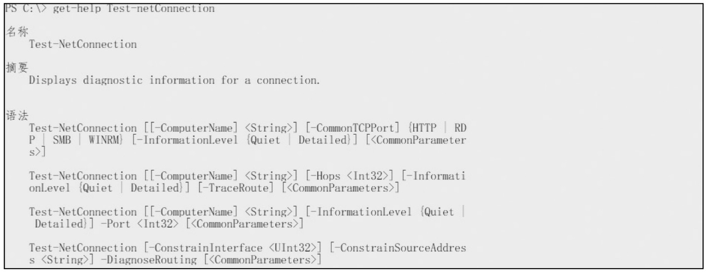 这个命令功能非常强大,替换了之前我们在Cmdshell中的3个命令。包含上面提到的Ping、Telnet和Tracert,都可以使用Test-NetConnection来进行操作。我们先来看下Test-NetConnection 帮助内容和操作,图4.64所示为Test-NetConnection的帮助内容。