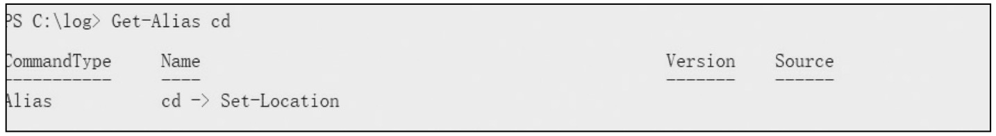 在Command命令中如果希望转换目录,都是通过CD 进行目录转换,在PowerShell 中,依然可以这么做,但是这个CD 是不是 change-directory,可以通过Get-Alias 来看下是不是这个命令,图4.53所示为获取Set-Location命令。