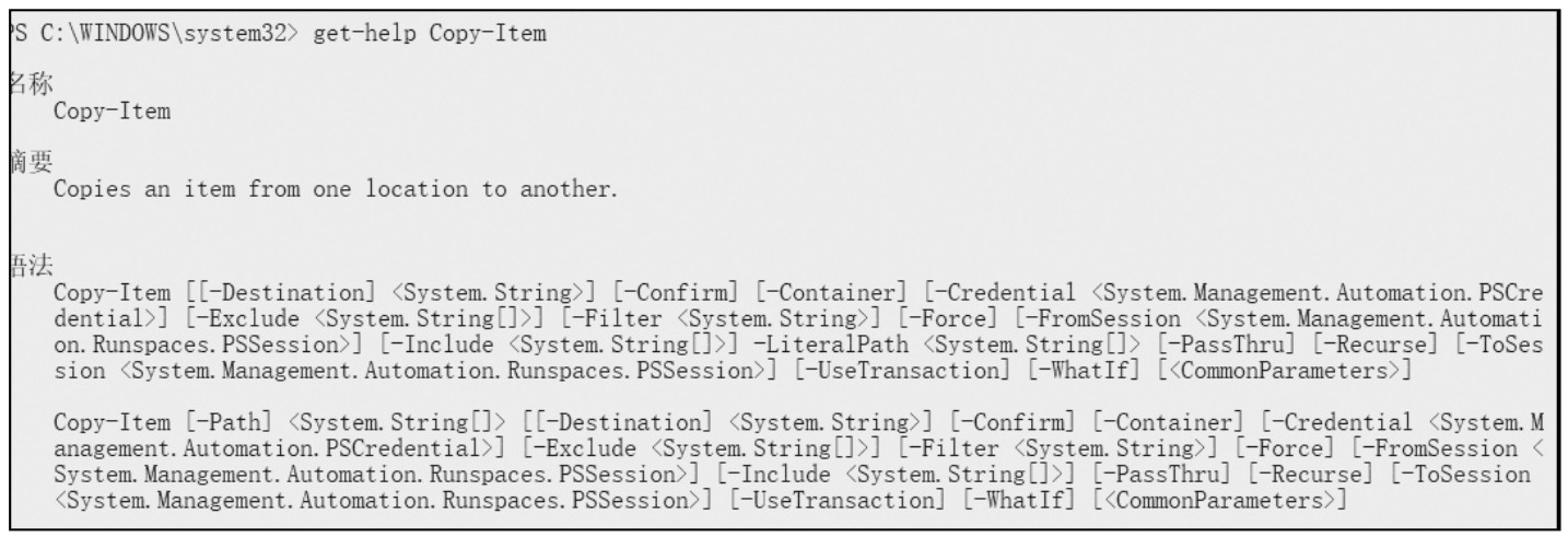 Copy-Item的功能是实现文件的复制,这里利用Copy-Item功能实现数据从源到目标路径的复制。图4.51所示为命令相关的帮助内容。