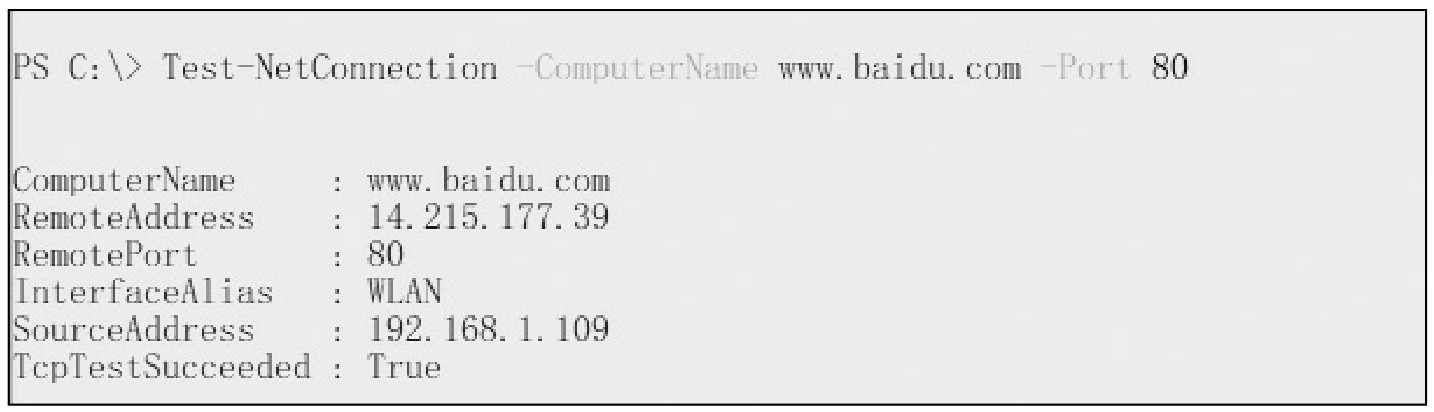 如果希望了解到目标网络中的特定端口是否能够正常通信,我们可以使用如图4.66所示的命令来验证端口是否通畅,这和我们早期使用的Telnet命令非常相似。