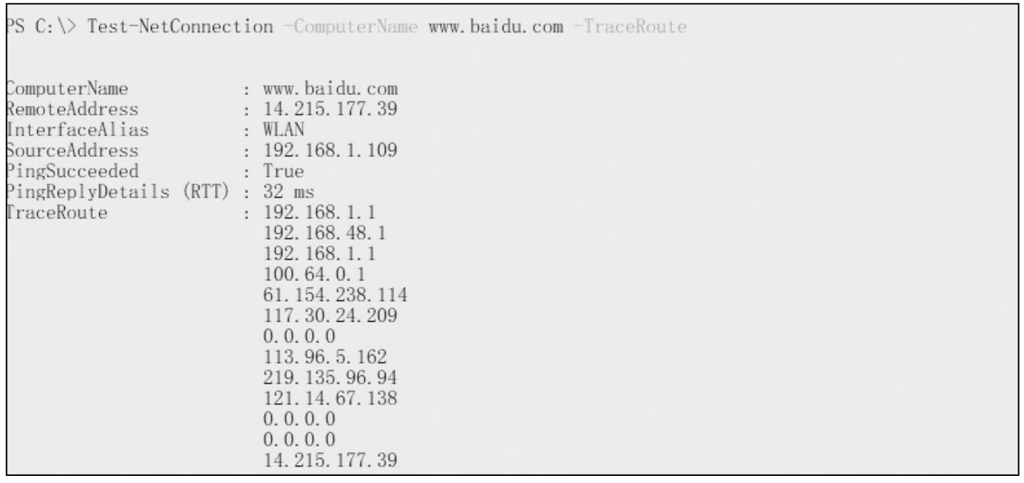 还有一个场景验证当前主机到目标主机的路由状况,这个也是通过Test-NetConnection来实现的,这里可以通过如图4.67所示的命令来实现当前IP到目标的路由状况,通过结果我们可以获取目标经过的路由和总共花费的时间。