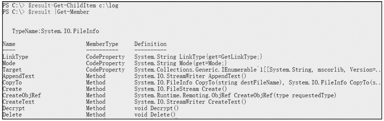 Get-ChildItem是PowerShell中使用相对比较频繁的命令,用来实现对象中的子集获取。以文件对象为例,通过Get-ChildItem获取文件夹下的文件数据,完成数据执行后数据的对象为文件系统,文件系统支持的属性和方法都会受到支持,图4.46所示为支持的属性和方法。