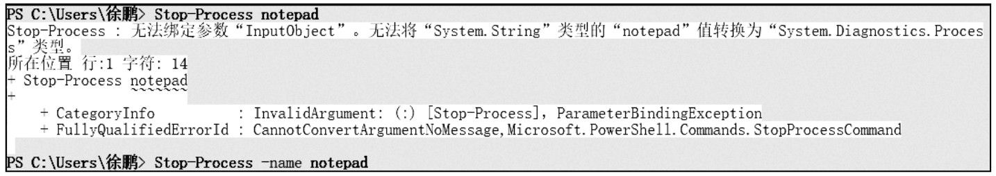 Stop-Process Cmdlet命令的作用是停止特定对象进程,在实际使用过程中Stop-Process很少单独使用,它通常和Get-Process命令一起使用,用于特定进程的终止。单独使用Stop-Process可以进行已有进程终止,如果进程本身不存在,则可能发生如图4.60所示的执行错误。