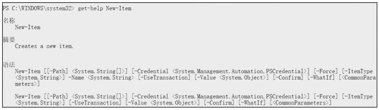 在PowerShell中New-Item可以说是使用频率相当高的命令,它的目标是新建,我们可以通过New-Item命令建立文件、目录、注册表等对象。它的使用方法如图4.35所示。