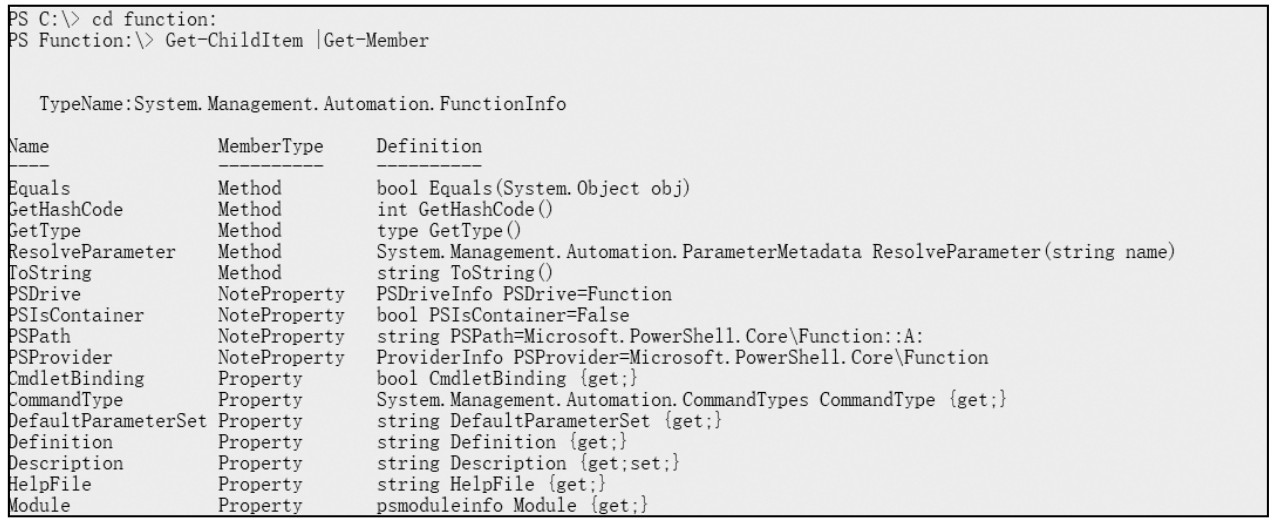 使用Get-ChildItem命令也可以获取到函数功能的对象,我们通过Get-ChildItem进行数据获取,获取当前函数的子属性都是函数类型,如图4.47所示的结果为函数子对象支持的属性和方法。
