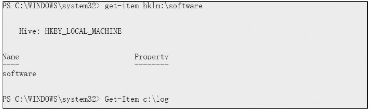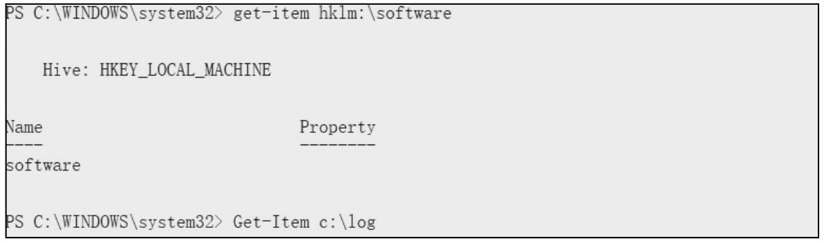 Get-Item也可以获取注册表信息,通过执行Get-Item 跟上注册表键值路径,就可以获取到相关的注册表信息,执行如图4.45所示的Get-Item hklm:\software 命令,可以加载Hive路径,同时也可以获取Software键值对应的属性。