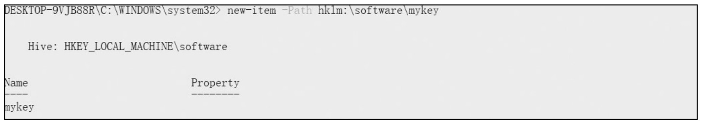 如果希望建立相对应的注册表键和注册表键值对,可以通过New-Item命令来建立,执行如图4.38所示的命令,即可完成注册表对象的建立。