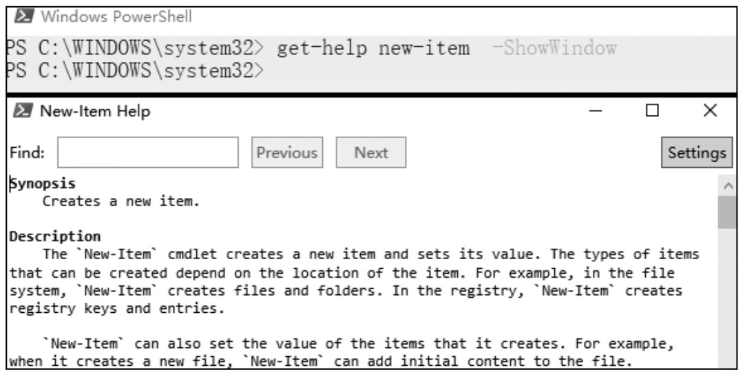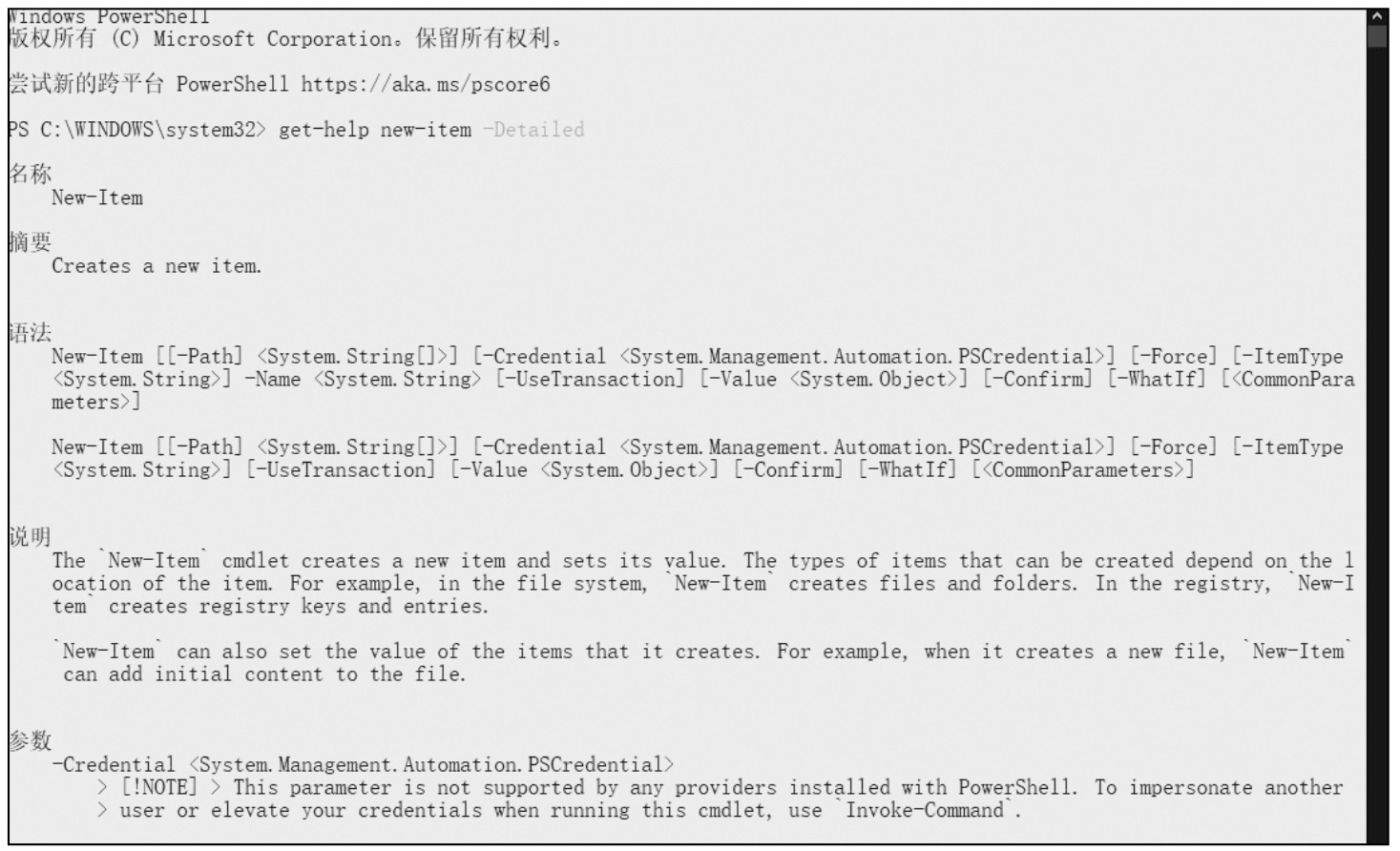当使用Get-Help Cmdlet(命令)的时候带上Detailed 参数,则会在命令的帮助内容中显示如图4.76所示的具体信息,将包含名称、摘要、语法、说明、参数等信息。