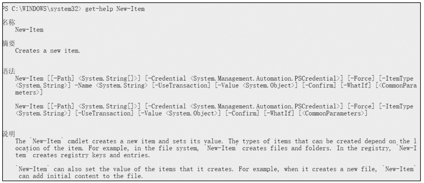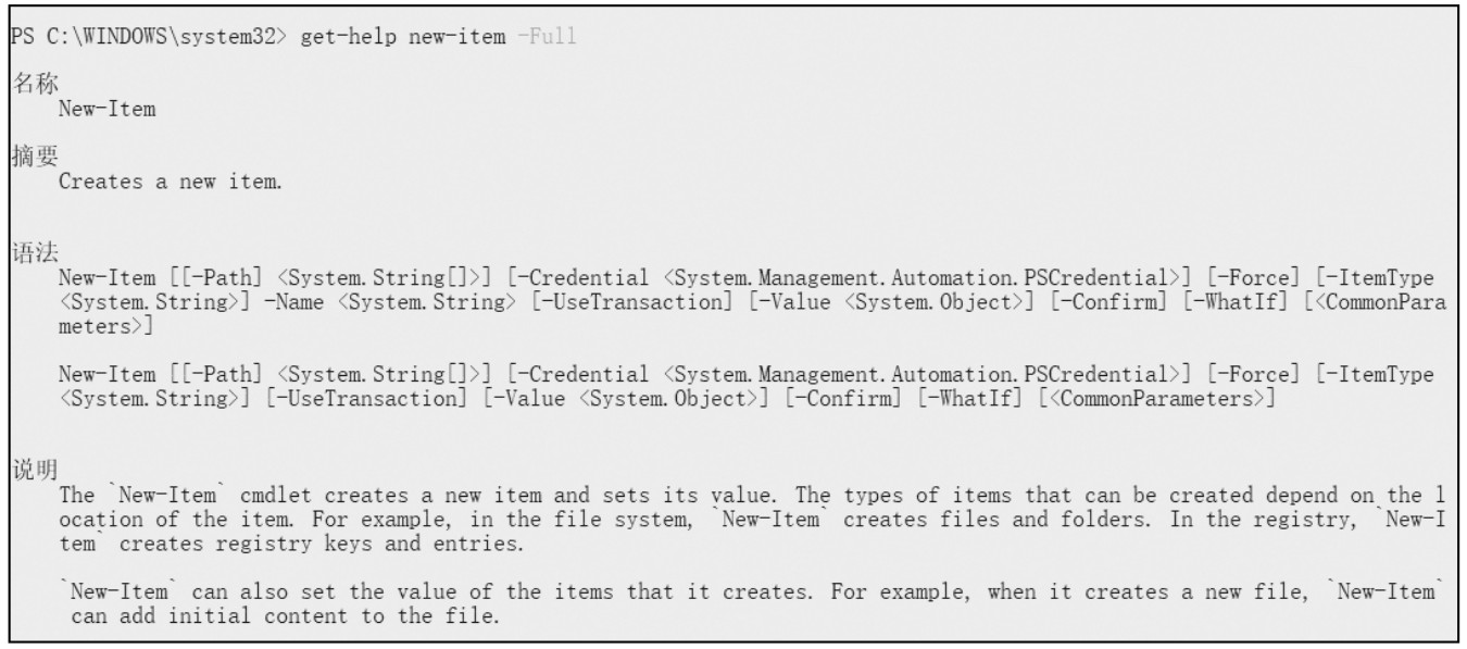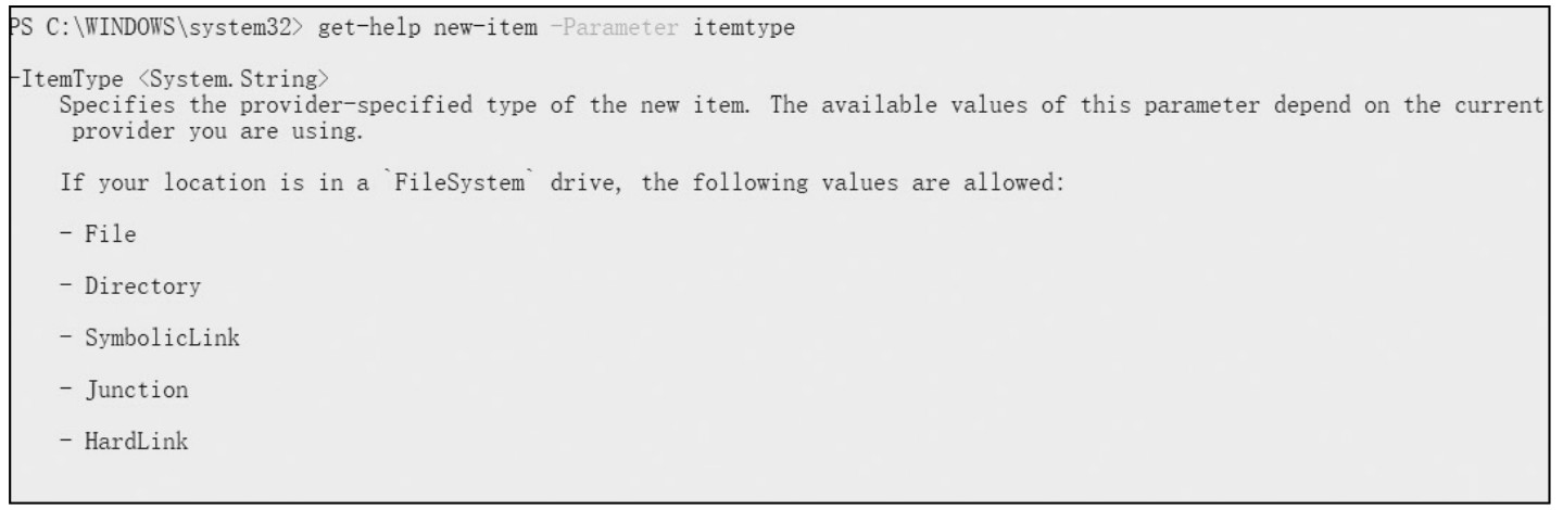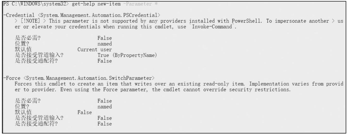在执行PowerShell命令的过程中可能不知道当前的Cmdlet存在哪些参数问题,参数是强制类型还是可选类型,参数是否支持管道符,相信大家在第一时间拿到命令的时候都会很迷糊,就使用Get-Help-Full进行查找,但是Full开关的内容实在太多而找不到重点,这时Parameter参数就有它的用武之地了。当希望获取当前命令的参数时,可以利用Get-Help Cmdlet-Parameter*来获取所有当前Cmdlet的参数,图4.79所示为New-Item Cmdlet 拥有的所有参数类型详细定义,这里会列出所有参数信息。