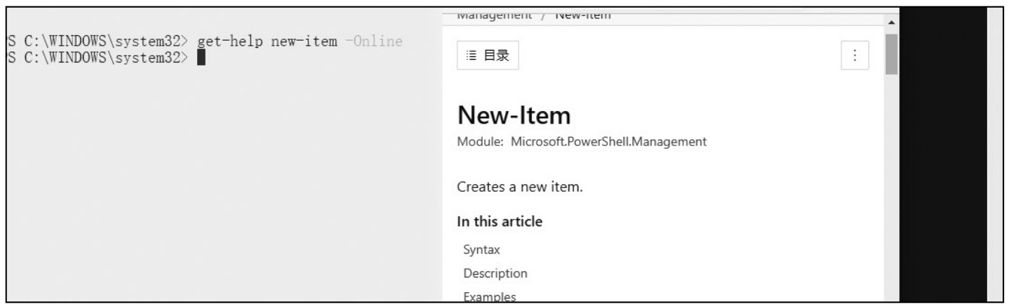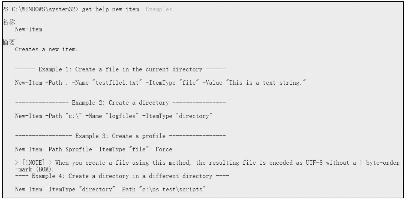 在命令帮助中如果仅仅需要示例,就可以用命令跟上Examples 参数来实现命令的案例介绍。以New-Item 为例,可以得到使用New-Item的各类案例,使用Examples 参数将显示如图4.77所示的具体信息。