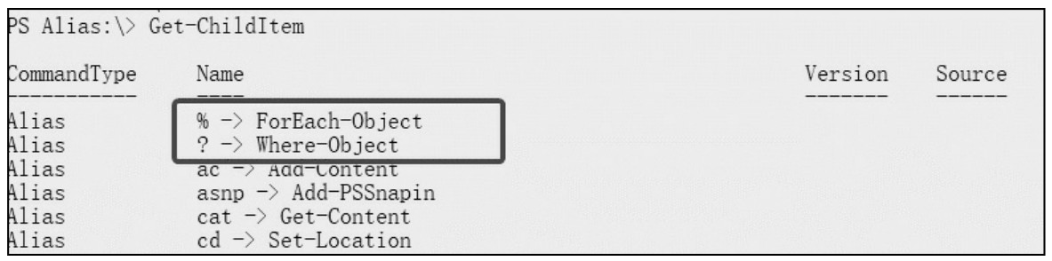 在PowerShell中有两个非常特殊的别名,这两个别名和其他别名完全不同,其他别名都是以字符进行定义,而这两个别名是以字符替代,图4.86所示为这两个别名。