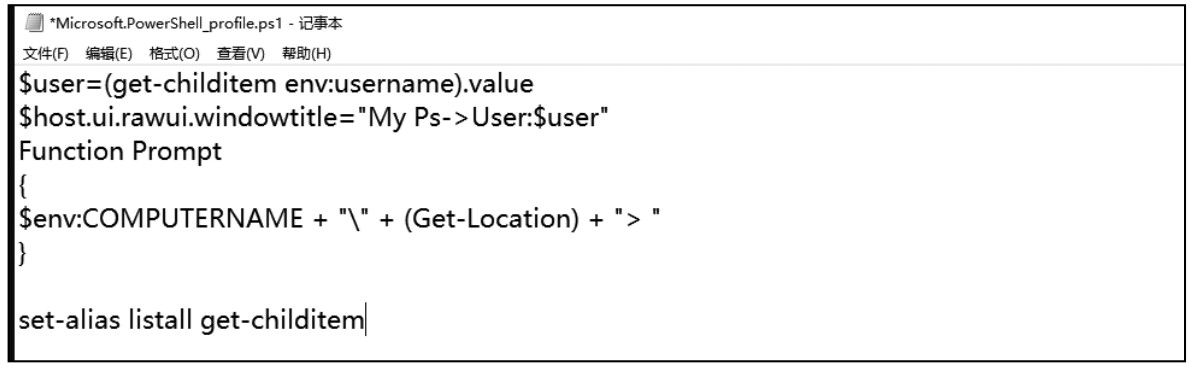 设置别名仅仅在当前Session中生效,如果关闭PowerShell的窗口,则当前定义的Alias别名就会消失。如果希望别名能够永久保存,即使关闭PowerShell 窗口或者关闭计算机,都可以保留别名,这时候我们需要在配置文件中添加设置别名命令实现别名的永久保存。在配置文件中保留了别名之后,不管是否关闭当前的PowerShell Session或者重启服务器,别名都将永远保留,图4.85所示为将别名操作保留在配置文件中。