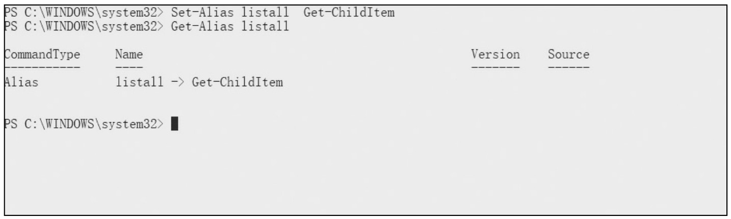 在PowerShell中存在一些名字特别长或者特别难以理解的命令,这时可以给命令起别名来替代原有的Cmdlet,帮助大家更快地理解和使用命令。别名仅仅是将命令以另外一个名称替代,参数使用依然遵循原来的Cmdlet 命令。定义别名的方式也非常简单,直接使用Set-Alias 命令就可以完成别名的建立,如图4.83所示。