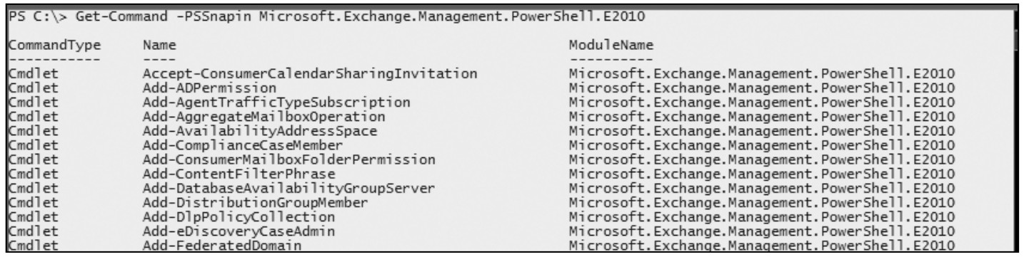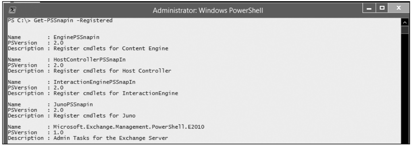 由于以管理单元加载的命令不多,这里以Exchange Server为例。Exchange Server 安装完成后,我们可以通过如下命令获取已经注册的管理单元。