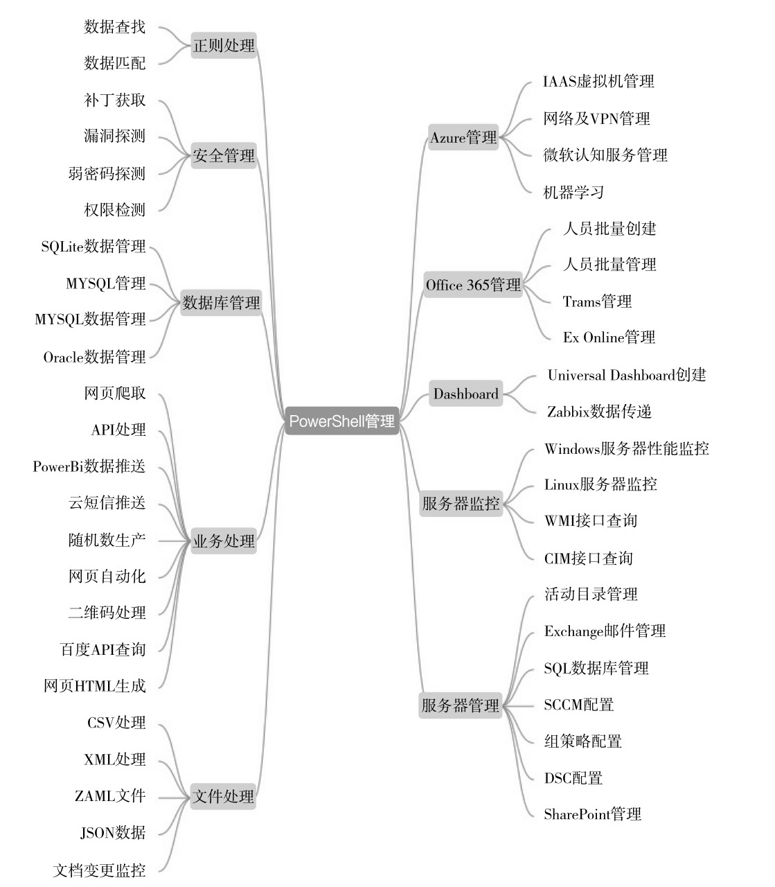 下面这张图片显示了PowerShell可以支持和处理的业务场景,来看看是不是有你需要的内容。PowerShell 针对微软系列产品提供的天然支持让编写脚本更加简单,安全、无毒、无害成为Windows编写脚本过程的标配,图1.8所示为PowerShell支持的管理方向和对象。