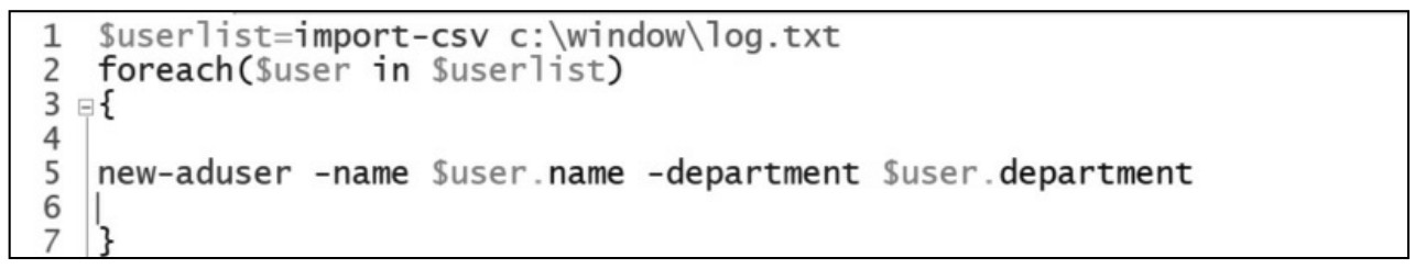 PowerShell的出现,让管理员们看到微软比较大的变化,每一条命令都非常类似于自然语言。命令的执行过程中不知道参数,直接按Tab键就可以显示出来。脚本写起来非常方便,命令的执行也变得非常简单,而且PowerShell可以直接调用微软相关程序的接口。试想一下,上面提到的批量创建用户的命令,如果改为PowerShell来编写,我们会发现如图1.7所示的简洁美。