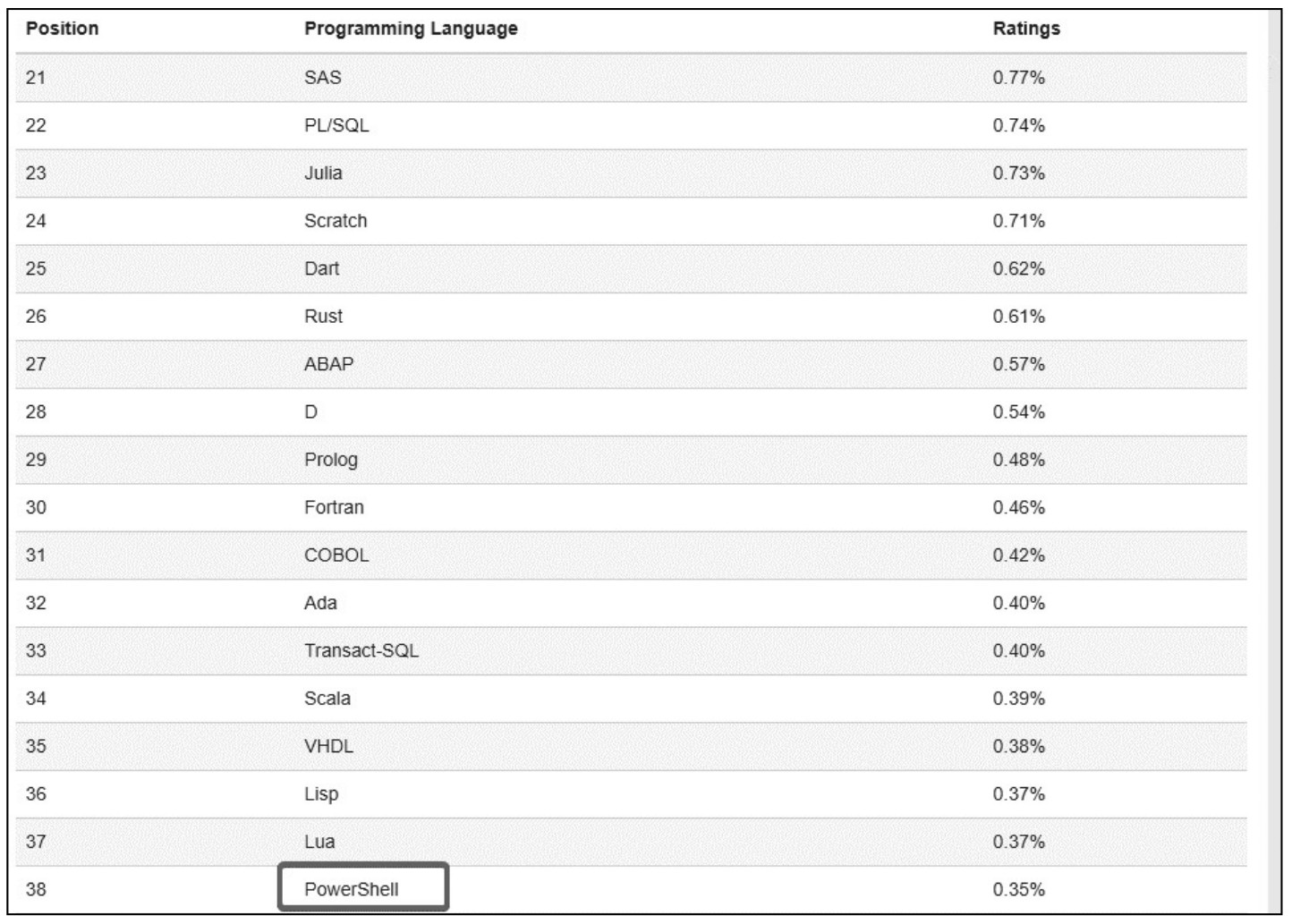 PowerShell 作为一个不算太热门的语言,目前在国内的关注度也不是很高,但是非常意外的是在Tiobe 的编程语言Index 指数中,排在了第38位,这也是一个相当不错的成绩,图1.9所示为PowerShell编程语言位于Tiobe Index的排名位置(2021年9月)。
