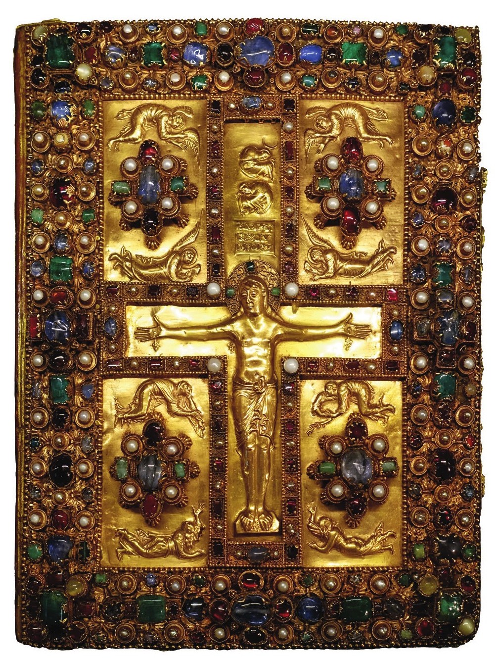 图5-6 基督上十字架,《林道福音书》封面,瑞士圣加仑,黄金、宝石和珍珠,约875—900年,35厘米×27.5厘米,纽约皮尔庞特摩根图书馆