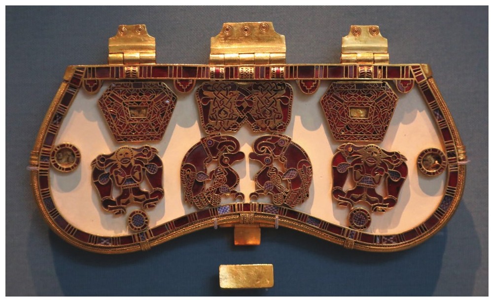 图5-1 囊包盖,出土于英国萨顿·胡船冢,黄金、玻璃、珐琅镶嵌石榴石和绿宝石,约625年,长19.1厘米,伦敦大英博物馆