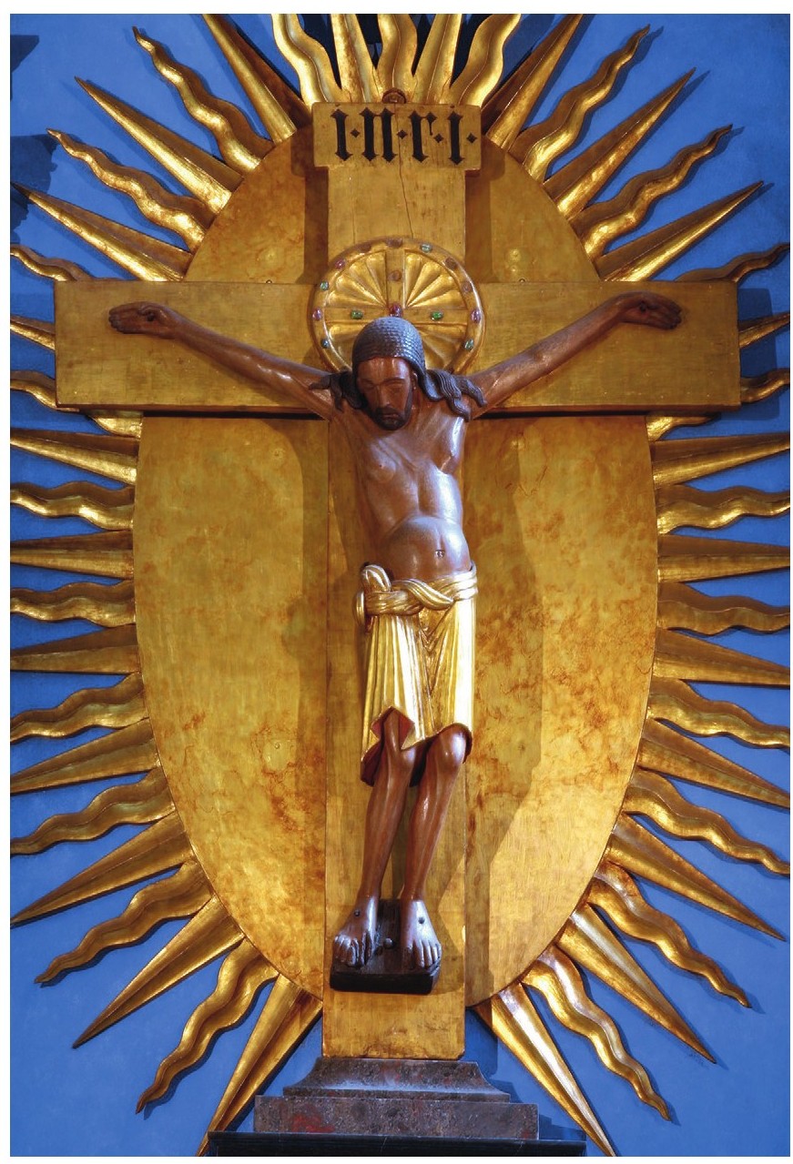 奥托王朝的雕塑艺术成就在《杰罗十字架》( Gero Crucifix ,图5-13)上表现得最为突出。公元970年左右,这件真人大小的雕像由科隆大教堂订制,以大主教杰罗(Archbishop Gero)的名字命名。《杰罗十字架》视觉效果震撼,具有很强的写实性和立体感,与加洛林时期《林道福音书》封面上的基督形象形成强烈的反差。《林道福音书》呈现的是早期基督教中程式化的、战胜了死亡的年轻基督形象;而《杰罗十字架》上的形象更接近于拜占庭艺术中的受难基督形象,他的脸上带有胡须,头顶流淌着鲜血,脸部因痛苦而变形,身体下垂,肩膀与胸之间的肌肉像是在撕裂,只有头顶的光环预示着他未来的复活。《杰罗十字架》表达了强烈的情感,显示了中世纪早期北欧艺术的表现力。