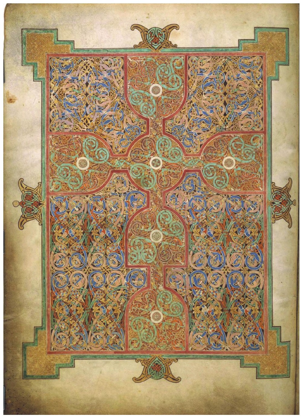 希伯诺—撒克逊艺术的一个重要代表是手抄绘本中的“织毯页”(carpet page)。它是夹在书页之间的整幅彩色细密画,插图画面内容与文本无关,纯属装饰,通常由抽象的动物纹样或字母图案组成,类似于织毯式样,因此得名。“织毯页”的艺术风格结合了早期西欧装饰艺术和基督教艺术传统。