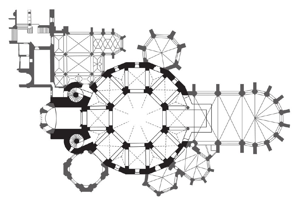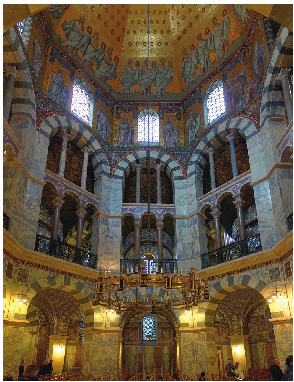 为了重现帝国的辉煌,查理曼大帝以罗马和拉文纳为样板,在德国亚琛建立了自己的都城。罗马曾是帝国的中心,而拉文纳则是拜占庭权力在西方的展示。查理曼大帝希望结合这两个城市的建筑特点,将亚琛建成基督教帝国的中心。建于8世纪末的亚琛皇宫显示了查理曼大帝作为基督教皇帝的地位。宫殿的主要建筑群以君士坦丁在罗马的拉特兰宫(Lateran Palace)为原型,而与查理曼大帝皇宫相连的礼拜堂(图5-7)则借鉴了拉文纳的圣维塔莱教堂。
