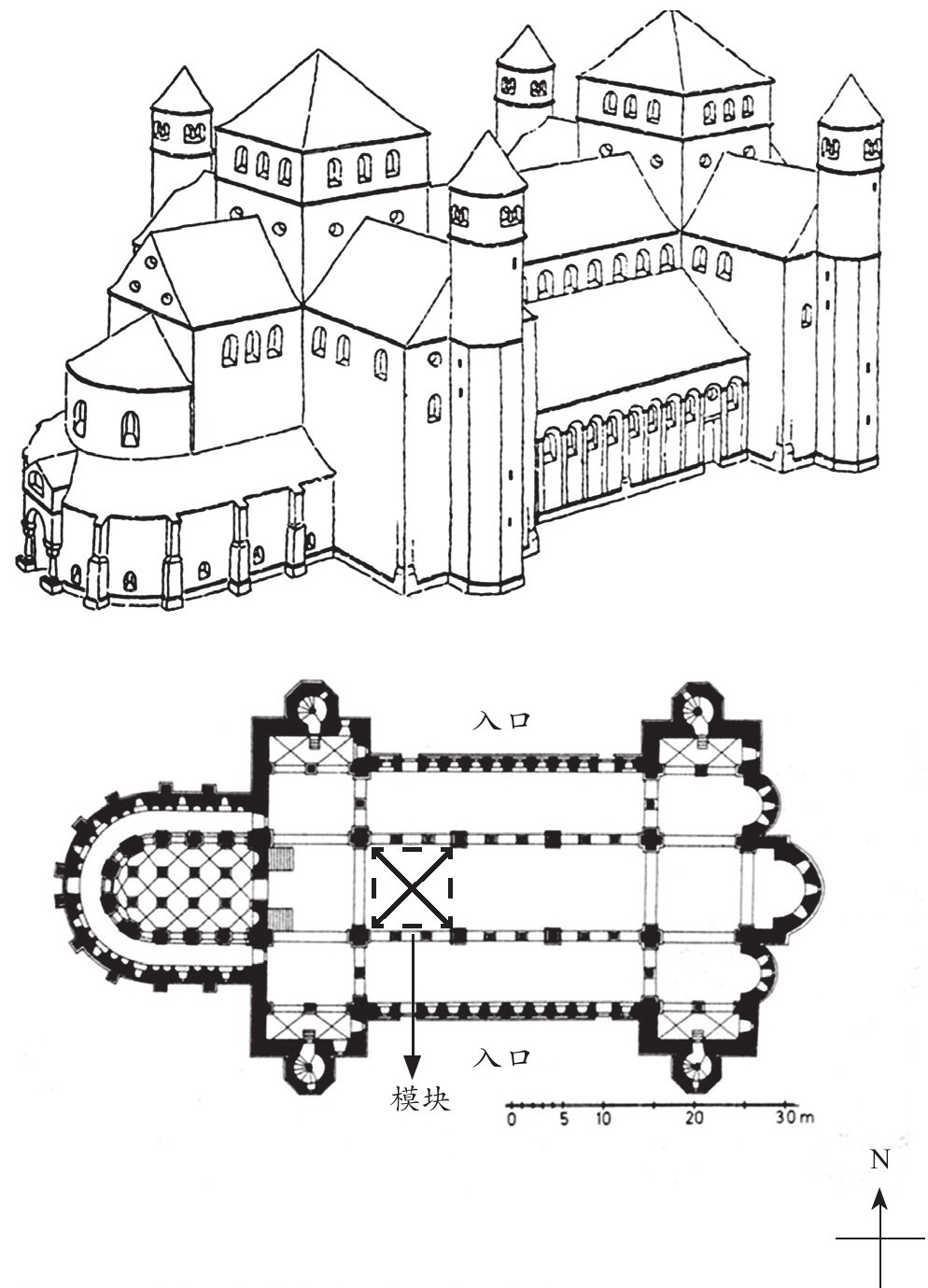 与圣加仑修道院的平面图一样,圣米迦勒教堂在空间划分上再次运用了数学模块系统(图5-11)。比如其以十字交叉方块为基本单元,中堂长三个单元,宽一个单元。设置在每个方块的墩柱不仅突出了模块的视觉效果,还取代了之前的双排柱廊形成替代性的支持系统,减弱了早期基督教堂隧道式结构的水平延展力,增强了垂直向上的视觉力度。